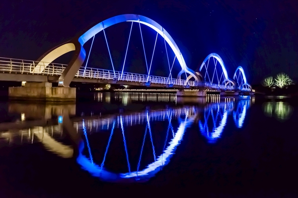 "Most Sölvesborg" poster od Kim Mortensen. Noční pohled na most Sölvesborgsbron vyniká svými elegantními kovovými oblouky, které se v modrém světle zrcadlí na klidné hladině vody. Tento nejdelší evropský pěší most svým futuristickým designem a jemným osvětlením vytváří atmosféru klidu i dobrodružství zároveň. Ideální motiv pro milovníky moderní architektury a nočních krajin, kteří chtějí dodat svému prostoru šmrnc a hloubku. Takový obraz prostě neomrzí.