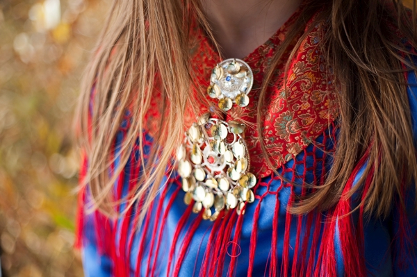 "Márge i kolt" poster od Sara Lansgren. Márge zachycuje detaily laponského kroje, kde se potkává tradice s energií okamžiku. Živá červená s bohatými ornamenty na límci kontrastuje s chladnou modří látky, zatímco třásně a stříbrné ozdoby hrají svou vlastní hru světla a pohybu. Je to jako kdyby se kultura z Jokkmokku proměnila v pulsující beat, který cítíš i bez hudby. Perfektní kousek pro ty, kdo hledají víc než jen oblečení – příběh zabalený do textilu.