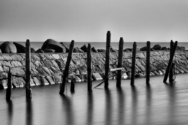 "Heard Hamn " poster od Jane Svensson. Černobílý pohled na přístav Hörte nabízí minimalistickou eleganci – opotřebované dřevěné kůly jako strážci z jiného světa, stojící v klidné hladině moře. Hladká voda zrcadlí ticho a zároveň něco nevyřčeného, zatímco drsné kameny na hrázi kontrastují s jemností vln. Je to moment, který zastavil čas – syrový, surový a přesto podmanivý. Perfektní pro ty, kdo hledají umění s nádechem příběhu a melancholie pobřeží.