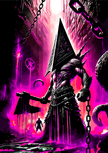 "Silent hill obr" poster od nagika. Obří postava s ikonickou pyramidovou hlavou stojí uprostřed ponurého světa, kde se tma míchá s elektrizující růžovou září. Řetězy, temné symboly a krvavá sekera v ruce vyprávějí příběh plný napětí a hrůzy, připomínající legendární Silent Hill. Atmosféra je hustá, nepředvídatelná – jakoby vás okamžitě vtáhla do děsuplné adventury, kde nevíte, co přijde. Tohle není jen obraz, to je výzva pro všechny fanoušky temných herních vesmírů.