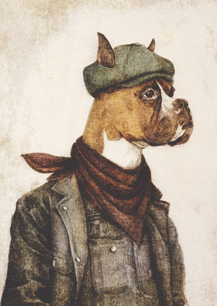 "This whimsical artwork features an anthropomorphic dog with a human-like appearance, dressed in vintage attire including a green cap and scarf. The dog exudes a regal, thoughtful expression. Perfect for fans of animal art and vintage aesthetics."