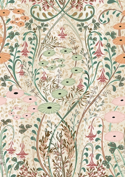 "This artwork showcases intricate floral patterns with elegant foliage, intertwining vines, and colorful blooms in soft pastel hues. It reflects nature-inspired design and vintage style, perfect for backgrounds or textiles."