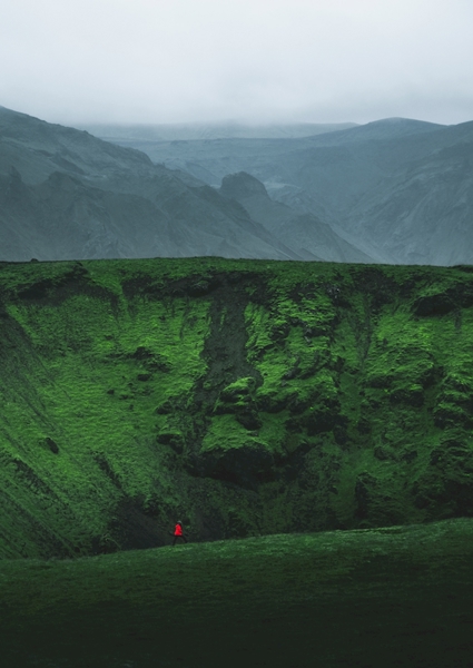 "Ostrov" poster od Carl Johan Johansson. Obraz zachycuje divokou, téměř mystickou krajinu Islandu, kde sytě zelené srázy kontrastují s chladnou mlhou v pozadí. Postava v červeném působí jako malý ostrov v moři přírody – jasný akcent, který vtáhne oči a připomene, jak malí a zároveň součástí všeho jsme. Tenhle kus přírody je zároveň scénou i hlavním hrdinou, kde každý detail vypráví příběh o síle a tichu. Pro všechny, kdo milují dobrodružství a nezkrotný duch severu.