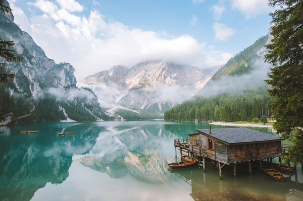 "Jezero Braies." poster od Federico De Angelis. Jezero Braies vypadá, jako by se zastavil čas. Tady je všechno tak čistý – voda zrcadlí tuhle horskou šílenost, mlha se plíží mezi stromy a dřevěná chata na kůlech si žije svůj vlastní klidný život. Dolomity v pozadí? Jo, ty tam jsou – majestátní a trochu zasněný, přesně jak to má být. Ráno, kdy všechno šeptá: „Vypni telefon, nadechni se, tohle je tvůj moment.“ Ideální pro všechny, kdo chtějí trochu italskýho ráje přímo doma na zdi.