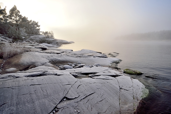 "Mlha nad jezerem Vänern" poster od Anneli Thoren. Mlha se zvedá nad jezero Vänern ve Skoghallu