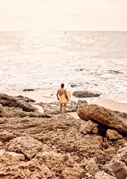 "Čekání" poster od Simon Walles. Surfař stojí na skalnatém pobřeží, prkno pevně v ruce, a dívá se na nekonečný oceán, který se třpytí ve světle zapadajícího slunce. Vzduch je nabitý očekáváním – ta chvíle, kdy je čas vyrazit, ale ještě ne. Kameny pod nohama kontrastují s tekoucí vodou, jako by přirozeně připomínaly, že každý moment čekání má svůj vlastní rytmus. Ideální kousek pro milovníky surfování i klidných oceánských snů.