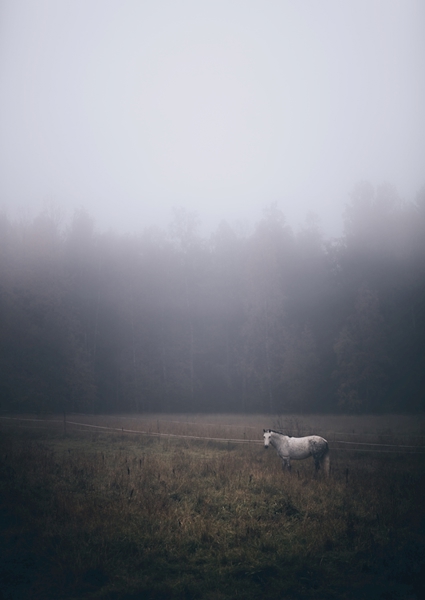 "Čas se zastavil" poster od Ulf Härstedt. Bílý kůň stojí osaměle na rozlehlé, mlhou zahalené louce, kde čas ztrácí svůj smysl. Tajemná mlha obalující stromy vytváří atmosféru mezi snem a realitou – jako kdyby se zastavil celý svět. Tohle není jen fotka, ale okamžik, kdy příroda mlčí a všechno kolem ztichne. Perfektní pro ty, kdo ocení divokost, samotu a podmanivý klid skandinávských krajin.