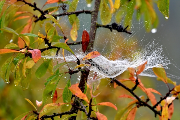 "Podzimní rosa" poster od Rune Carlsson. Jednoho listopadového rána, když ve vzduchu visel déšť a vlhko, se mezi větvemi objevily pavučiny. Vypadá to, že se oblékali na večírek. Může být potřeba ve tmě.