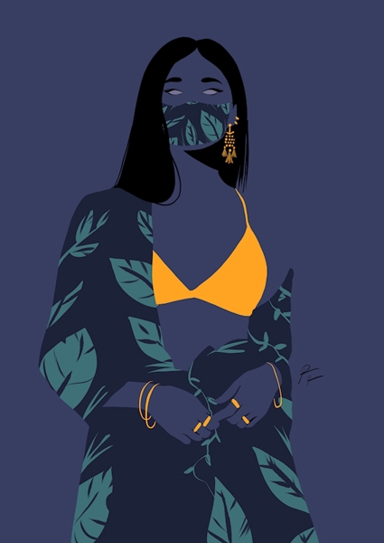 "Večer" poster od Rickard Bengtsson. Žena zahalená listovým vzorem, který se táhne od roušky přes volný plášť až po rukávy. Žluté bikiny jako odvážný kontrast na temném monochromatickém pozadí – to je Night. Minimalistická, ale přitom výrazná. Tenhle obraz říká: móda a příroda nejsou nepřátelé, spíš parťáci v jednom stylovém příběhu. A ty detaily? Šperky a držení těla? Čistá sebedůvěra, která neřeší trendy, ale sama sebe. Moderní elegance, která si hraje s listím a barvami – prostě cool.