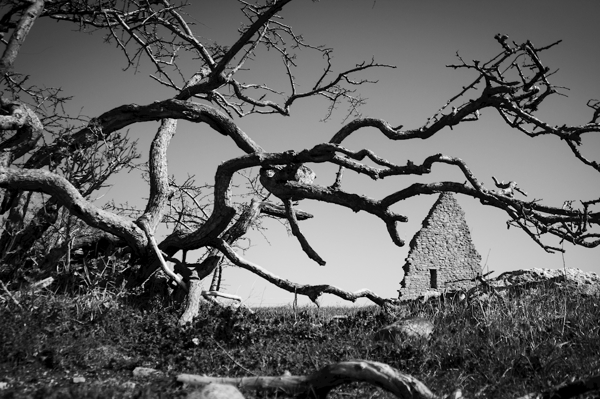 "Rozvaliny" poster od Maria Fagerström. Stíny zkroucených větví obepínají zbytky kaple svaté Birgitty na ostrově Öland, jako by se příroda rozhodla převzít nadvládu nad lidskou stopou. Černobílý kontrast vystupňuje drsnou krásu rozpadající se kamenné věže a dodává scéně nádech tajemna. Je to moment, kdy historie potkává surovou přítomnost, a vyvolává otázku – co všechno už bylo zapomenuto? Pro milovníky syrové estetiky a příběhů, které mluví beze slov.