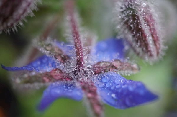 "V blízkosti deště" poster od Karolina Gustavsson. Detailní záběr na modrý květ brutnáku, který je pokrytý kapkami deště. Každá kapka vytváří malý křišťálový efekt, který dodává celému obrazu jemný lesk a kouzelnou atmosféru. Jemné chloupky na stoncích a lístcích se v kapkách jasně odrážejí, jako by rostlina právě vystoupila z pohádky. Příroda v nejmenších detailech – taková, která si zaslouží pozornost a obdiv. Skvělý kousek pro milovníky makrofotografie a přírodních zázraků.
