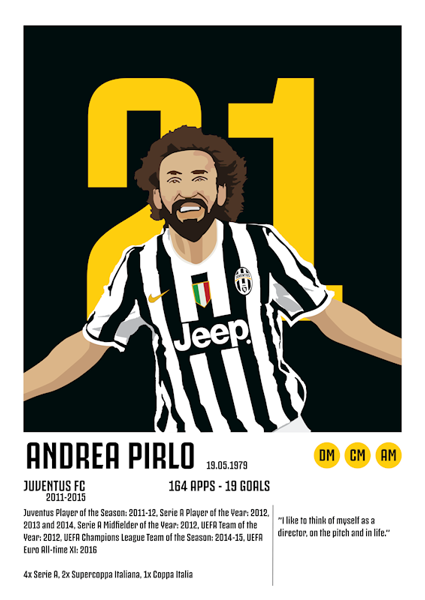 "Andrea Pirlo Poster played for many successful seasons for Juventus in Serie A. Andrea Pirlo was also involved and won the World Cup for Italy in Football."