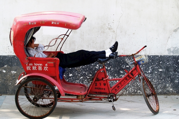 "Nohy nahoru" poster od Per Lidvall. Jasně červené biketaxi zaparkované v ulicích Suzhou dává jasně najevo, že tu dneska nikam nespěcháme. Řidič s nohama vystrčenýma, oči zavřený – totální chill v srdci města. V pozadí lehce rozmazaný betonový reliéf, který kontrastuje s živou červenou barvou. Není to jen dopravní prostředek, ale momentka městského lenošení, kdy všechno může počkat. Pro ty, co vědí, že někdy stačí jen sedět, vydechnout a nechat svět plynout.