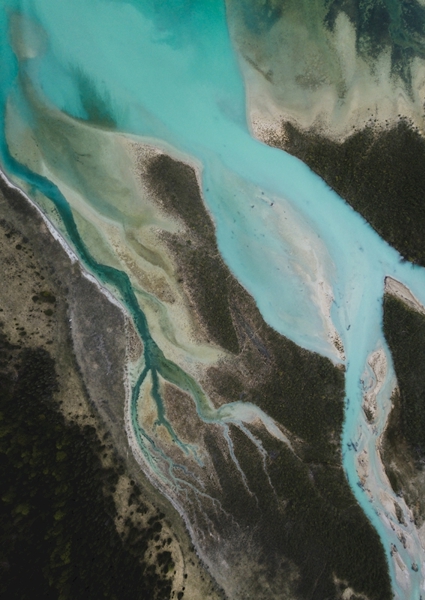 "Ledovcová řeka shora" poster od Lukas Saalfrank. Jako kdyby se modrozelená řeka ztrácela v labyrintu kamenů a hlíny, která ji drží na uzdě. Tenhle pohled z výšky ukazuje, jak se příroda ráda hraje s barvami i tvary – něco mezi abstraktním uměním a živým organismem. Glaciální řeka v srdci Alp se rozlévá, rozvětvuje a zároveň působí neuvěřitelně klidně. Ideální pro každého, kdo ocení divokou krásu přírody s nádechem surrealismu.