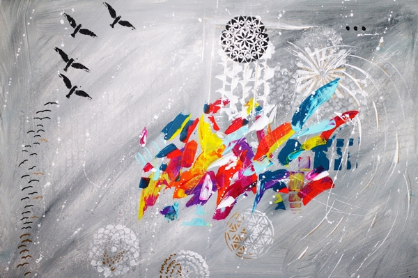 "Wellness" poster od Hans-Jürgen Kubsch. Barvy jako explodující konfety na šedém pozadí – tohle není jen obraz, ale malý chaos klidu. Barevné fragmenty tančí uprostřed meditativní šedi, která připomíná mlžný opar nebo ranní rozcvičku v oáze. Ptáci stoupají vzhůru, jako kdyby chtěli z té šedé reality uniknout, zatímco mandaly dodávají celku ten správný vibe jógy a harmonie. „Wellness“ tady není jen téma, je to zážitek, který se chce rozlétnout do prostoru i hlavy.