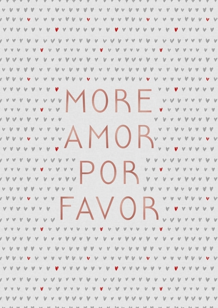 ""More Amor Por Favor" is a love quote in rose gold. The background is filled with little love hearts in red and grey."