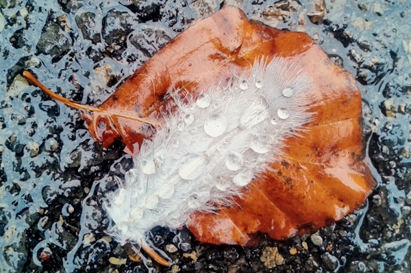 "Zázrak přírody" poster od Jutta Lorsch. Na mokrém asfaltu se leskne rezavý podzimní list, který objímá jemné bílé pírko pokryté kapkami rosy. Kontrast chladné bílé a teplé oranžové barvy vytváří nečekanou harmonii – příroda v miniaturách, zachycená v okamžiku, kdy se zdá, že čas zpomalil. Tenhle moment je jako tichý šepot podzimu, který vás nutí zastavit se a ocenit tyhle malé, ale neuvěřitelně poetické zázraky všedního dne.