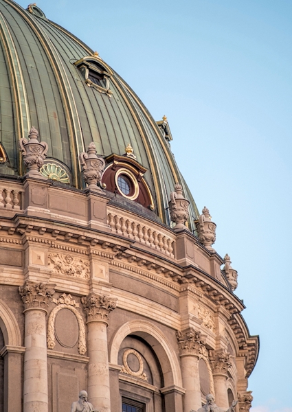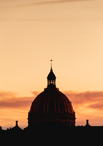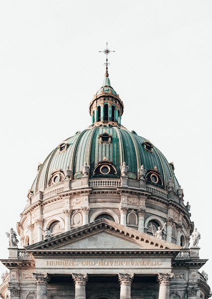 "The Marble Church, or Frederiks Church is one of the highlights of Copenhagen. During the golden hour I took this close up of the green copper dome. The sunlight creates a magical golden glow on the bricks of the building. The light blue sky in the background contrasts beautifully with the dome. "