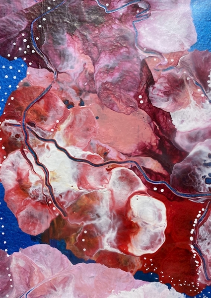 "Flowing acrylic in red and pink dancing on a blue background. This painting will be smashing on your wall."