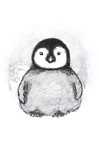 "Malý tučňák" poster od Sabrina Brückner. Roztomilý tučňák jako by vypadl z rozcuchaného snu – černobílý, načmáraný stylem, který připomíná dětské čmárání, ale s nečekanou grácií. Jemné akvarelové pozadí dodává dílu lehkost a snivost, zatímco hravé linky vytvářejí dojem pohybu a života. Perfektní parťák do dětského pokoje, který rozproudí fantazii a vykouzlí úsměv na tváři. Takový ten obraz, co obejme bez jediného slova.
