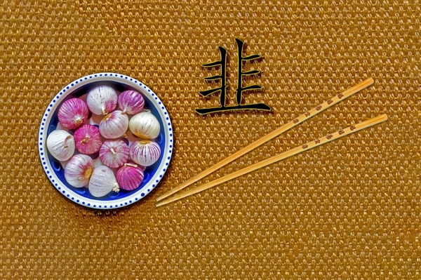 "Asijská kuchyně" poster od Leopold Brix. Barevná miska plná česnekových palic v odstínech bílé a růžové odpočívá na hrubé texturované podložce, která připomíná přírodní materiály. Vedle ní leží elegantní dřevěné hůlky – symbol asijské tradice a stolování, které dodávají scéně autentický nádech. Na pozadí se objevuje výrazný čínský znak, který přidává vizuální i kulturní hloubku. Opravdu jednoduché, ale zároveň plné příslibů chutí i příběhů. Perfektní doplněk do kuchyně, která miluje barvy i tradici.