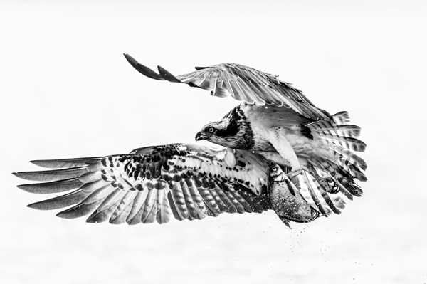 "Fiskgjuse" poster od Roger Bäck. Osprey v plném letu, křídla rozevřená jako na pódiu – žádná póza, jen surová síla a precizní dravost. V drápech drží čerstvou kořist, která je důkazem jeho mistrovství lovce. Černobílá paleta zdůrazňuje každý detail peří a ostrý pohled, co říká: "Jsem tady, ať si to všichni zapamatují." Tenhle kousek nese ducha divoké přírody Stockholmu, kde krásu a drsnost příroda servíruje v jednom balení. Prostě must-have pro fanoušky nezkroceného života.