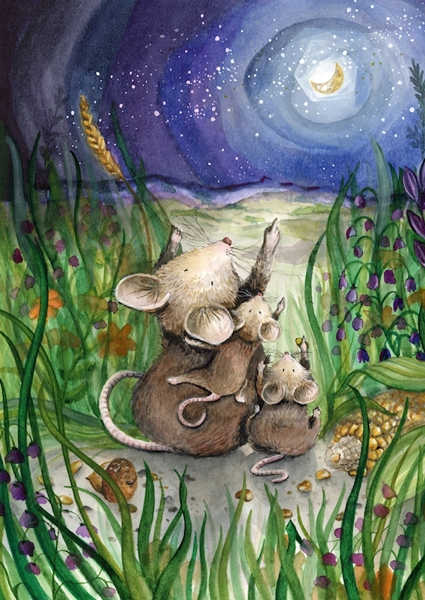 "This cute motif is hand painted in watercolours with a lot of dedication and passion. It shows a small family of mice in the middle of nature, looking at the moon. A must-have for all little adventurers and nature lovers, and an eye-catcher in any nursery."