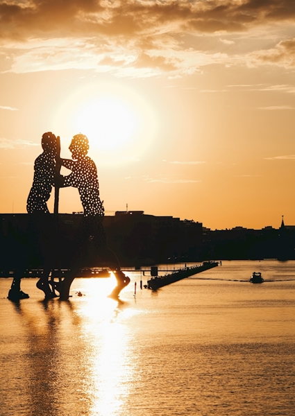 "Molecule Man Berlin" Poster von tonihofmannfilms. Die Molecule Man-Skulptur in Berlin verschmilzt mit dem Abendlicht auf der Spree – zwei Figuren, die fast tanzen, fast verschmelzen, aber doch getrennt bleiben. Die goldene Sonne taucht alles in ein warmes Leuchten, das die Verbindung zwischen urbanem Leben und Natur spürbar macht. Ein Moment, der Berlin-Feeling pur einfängt – roh, lebendig und irgendwie magisch. Perfekt, wenn du Kunst suchst, die nicht nur Dekoration ist, sondern zum Nachdenken anregt.