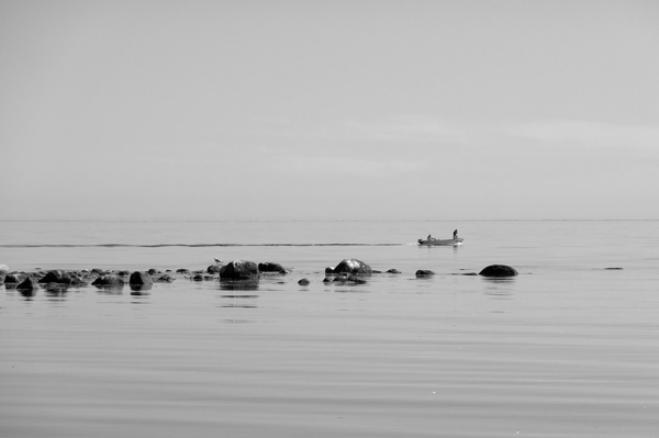 "Auf einem Angelausflug" Poster von Lars Ödemark. Glatt wie ein Spiegel gleitet das kleine Fischerboot übers stille Wasser vor Ölands Küste. Nebelschwaden umhüllen die Szene – so als hätte die Zeit kurz Pause gedrückt. Die Felsen blinzeln aus dem Meer, während der Morgen noch ganz frisch und unberührt wirkt. Ein Moment, der mehr sagt als Worte – fast wie ein leises Versprechen, dass hier noch alles möglich ist. Perfekt für alle, die das ruhige, echte Leben in Schwarz-Weiß feiern.