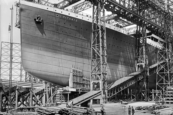 "The picture shows the RMS Titanic, shortly before launching. In a few days she will be launched and prepared for the installation of furniture and boilers. The empty ship currently weighs only about 20,000 tons. Excitement is in the air as completion approaches. "