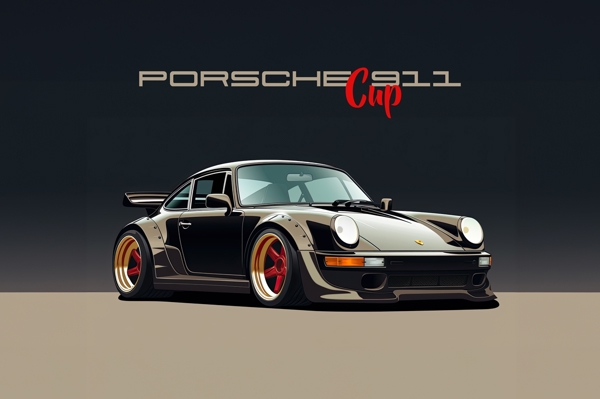 "Eine schwarz-goldene, minimalistische Vektor-Illustration des Porsche 911 (80er Jahre) Cup-Version. Klare Linien, Goldnuancen und rote Felgen betonen sein Rennerbe. Stilvoll und ikonisch."