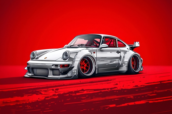 "Eine rote, minimalistische Vektor-Illustration des Porsche 911 (90er Jahre) Cup-Version. Klare Linien, Rote Felgen betonen sein Rennerbe. Stilvoll und ikonisch."