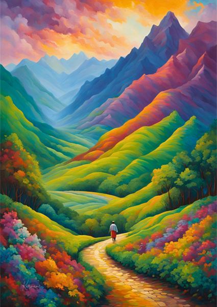 "Der Weg der Farben" Poster von Karmamè. Ein Pfad durch ein Farbenmeer, das sich wie ein Traum in sattes Grün, warmes Orange und kühles Blau hüllt. Die Berge wirken fast zu perfekt, um echt zu sein – als wären sie direkt aus einem Feel-Good-Game entsprungen. Ein einzelner Wanderer schlendert gemütlich durch diese lebendige Kulisse, die mehr nach innerer Reise als nach Wanderroute aussieht. Perfekt, wenn du deinem Raum etwas Kreativität und Ruhe verleihen willst, ohne komplett abzutauchen.