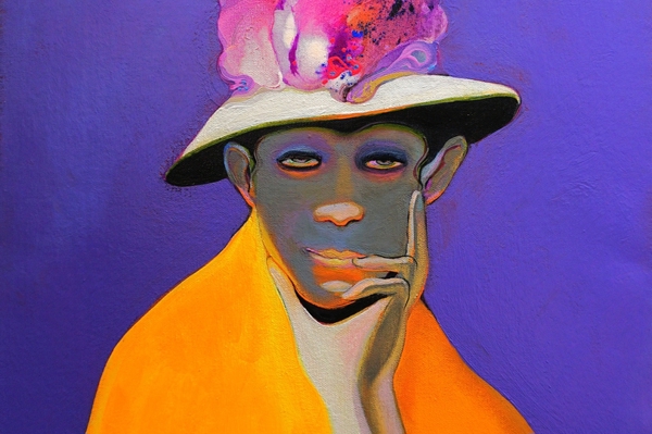 "This vibrant artwork by V. Tkachenko features a contemplative figure in a colorful hat against a purple backdrop, blending surrealism and modern art techniques, creating a striking visual contrast with expressive colors and bold design."