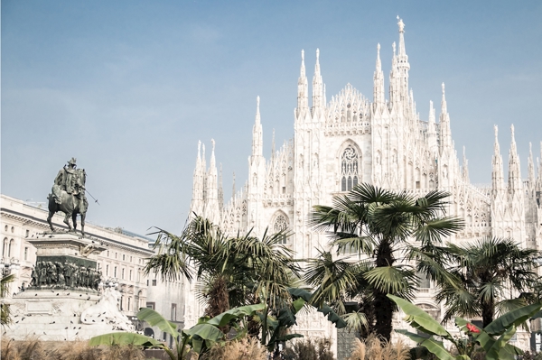 "Mailänder Dom" Poster von Jean Lapin. Diese Darstellung des Duomo di Milano zeigt die beeindruckende Kathedrale, die sich mit filigranen Spitzen gen Himmel reckt. Palmen und sattes Grün sorgen für einen unerwarteten, fast tropischen Kontrast zur steinernen Architektur. Im Vordergrund posiert eine Statue, die Geschichte atmet, während der klare Himmel das Ganze in zeitlose Ruhe taucht. Urbanes Flair trifft hier auf majestätische Baukunst – ein echter Hingucker, der dich direkt nach Mailand katapultiert.