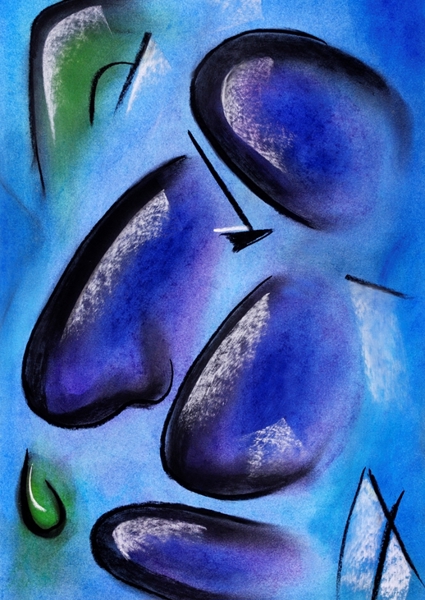 "Abstraktes Gesicht - Pastellkreidebild von Chris Schäfer - Mann mit tropfender Nase in Blau"