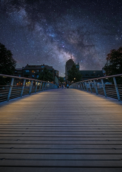 "Milchstraße" Poster von Reza Askari. Der Blick schweift über eine Brücke in Halmstad – geradewegs hinein in ein nächtliches Sternenmeer, das fast greifbar scheint. Die Milchstraße zieht sich wie ein kosmisches Band durch das dunkle Blau, während die Stadt im Hintergrund schläft. Das Bild fängt diesen Moment ein, in dem Erde und Universum sich fast berühren – eine Szene, die dich kurz den Alltag vergessen lässt und dich auf eine stille Reise mitnimmt. Fast wie ein Portal, nur ohne Wartezeit.
