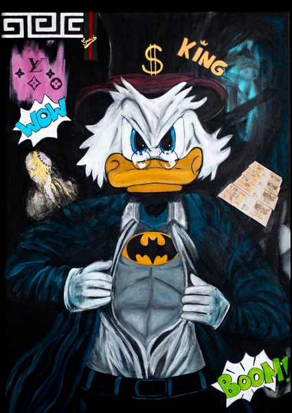 "Wanted to create a fun but at the same time slightly cocky interpretation of richness. Scrooge McDuck meets Batman and Banksy. The originalpainting is made with acrylic and mixed media"