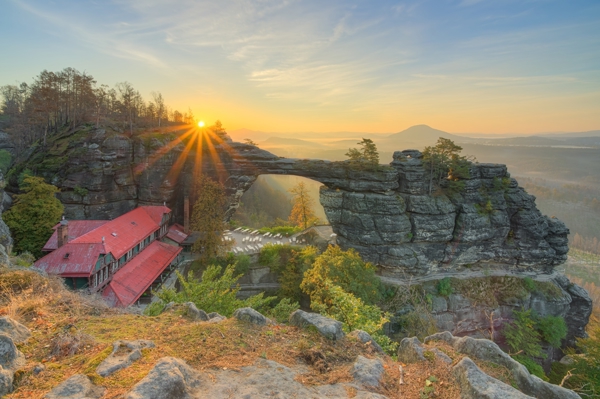 "Sonnenaufgang beim Prebischtor im böhmischen Teil des Elbsandsteingebirges. Es ist die größte natürliche Sandstein-Felsbrücke Europas und ein herausragendes Naturdenkmal der Böhmischen Schweiz."
