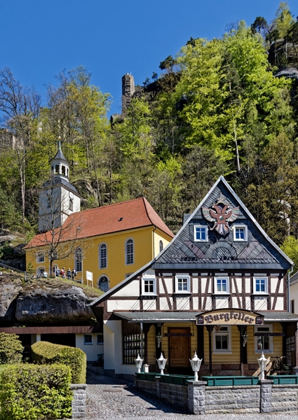 "Die Kirche am Berg Oybin mit der Kloster- und Burgruine. Umgeben von schönen Fachwerkhäusern im Zittauer Gebirge dem Ausflugsziel in Sachsen."