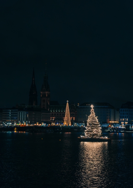 "Alster bei Nacht | Hamburg" Poster von Nils Hornschuh. Hier schwimmt kein gewöhnlicher Weihnachtsbaum, sondern ein leuchtendes Statement auf der Alster. Die funkelnden Lichter spiegeln sich im Wasser, während das Hamburger Rathaus und die Kirchen im Hintergrund still ihren nächtlichen Auftritt haben. Stadtleben trifft Festtagszauber – und plötzlich wird dir klar, dass Hamburg auch nachts richtig strahlen kann. Perfekt, wenn du deinem Zuhause diesen unverwechselbaren, urbanen Weihnachtsflair verleihen willst.
