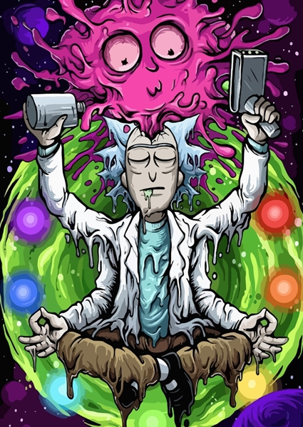 "Picture of Rick Sanchez meditating in colorful colors like in another dimension"