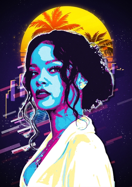 "Rihanna" Poster von ByTvv. Ein Porträt, das knallt – elektrisches Blau trifft auf neonpinke Akzente. Rihanna im Retro-Sonnenuntergang, Palmen wippen im Hintergrund, und die Stimmung? Absolut vibrierend. Das Bild bringt den Spirit von Musik, Fame und einem Hauch 80er-Nostalgie zusammen. Perfekt, wenn du Bock auf Popkultur hast und deinen Raum mit cooler Energie füllen willst. Ein Eyecatcher, der mehr als nur Deko ist.