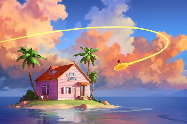 "Kame-Haus" Poster von Steve Dom. Eine kleine, pinke Insel – Kame House – mitten im Ozean, umgeben von Palmen und einem Himmel, der gerade Feuer fängt. Der Sonnenuntergang spielt hier mit Wolken in Orange und Blau, während ein feuriger Schweif durch die Luft zischt. Klar, das ist nicht irgendein Haus, sondern DER Spot aus Dragon Ball Z. Für alle, die wissen, wo die Action wirklich startet. Ein Stück Anime-Kult zum Abhängen und Träumen.