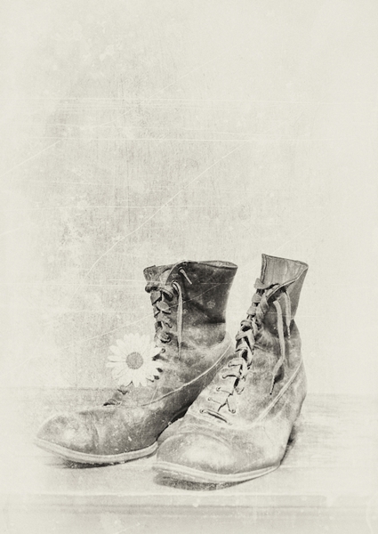 "Worn leather granny boots with a daisy flower as detail, textured in black and white tones with scratches and stains for an oldfashion feeling."