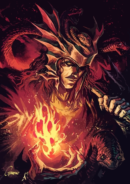 "Elden Ring" Poster von MAns. Dieses Kunstwerk entfacht eine explosive Mischung aus Magie und Gefahr – ein Charakter, der mit loderndem Feuer in der Hand und einer Krone aus giftigen Schlangen die Dunkelheit beherrscht. Die intensiven Rot- und Orangetöne wirbeln wie ein Inferno um ihn herum, als würde jede Farbe Geschichten von epischen Abenteuern und dunklen Geheimnissen erzählen. Perfekt für alle, die Gaming und Fantasy lieben und gern in eine andere Welt abtauchen. Elden Ring mal ganz anders – wild, fesselnd und voller Energie.