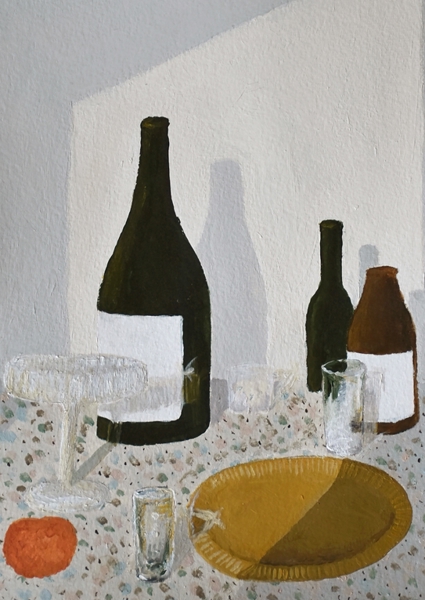 "The bottles are empty, and the glasses drained. Left on the countertop, they’re all shining in the sunlight, creating a sense of calm after the fun that just passed."