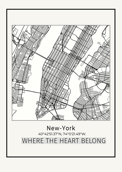 "Koordinaten der Stadtkarte von New York City " Poster von adi perets. Dieses Kunstwerk fängt den unverwechselbaren Rhythmus von New York City ein – das komplexe Netz aus Straßen, das wie ein Puls durch die Stadt fließt. Schwarz-weiße Linien in minimalistischer Klarheit, die das urbane Geflecht auf den Punkt bringen. Die Koordinaten? Klar, das ist deine Einladung, mitten rein ins Herz dieser Metropole zu springen. Für alle, die nicht nur eine Karte wollen, sondern ein Stück New Yorks Seele an ihrer Wand. Ganz ohne Schnickschnack – einfach nur pure City-Vibes.