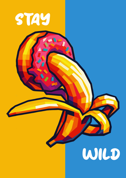 "Bleib wild" Poster von Store_Fille. Ein frecher Mix aus Banane und Donut, der den Mund wässrig macht und gleichzeitig Grenzen sprengt. Knallige Farben treffen auf poppige Illustration – perfekt für die Küche oder jeden Raum, der ein bisschen mehr frechen Charme verträgt. „Stay Wild“ ist hier nicht nur ein Spruch, sondern eine Einladung, das Gewöhnliche mal ordentlich aufzumischen. Kunst, die mit einem Augenzwinkern sagt: Lass es krachen!