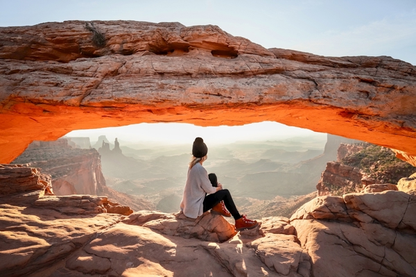 "Canyonlands Nationalpark" Poster von Kira Planken. Das hier ist kein gewöhnlicher Ausblick – ein natürlicher Rahmen aus rotem Fels, der den Canyonlands Nationalpark in den frühen Morgenstunden einfängt. Die Luft ist frisch, der Nebel noch leicht, und jemand sitzt einfach da, nimmt alles in sich auf. Dieses Bild trägt das Gefühl von Freiheit, Abenteuer und diesem unstillbaren Drang, rauszugehen und die Welt zu entdecken. Fast so, als würdest du selbst dort sitzen und denken: „Wow, das ist echt was anderes.“ Ein echtes Stück Naturwunder für dein Zuhause.